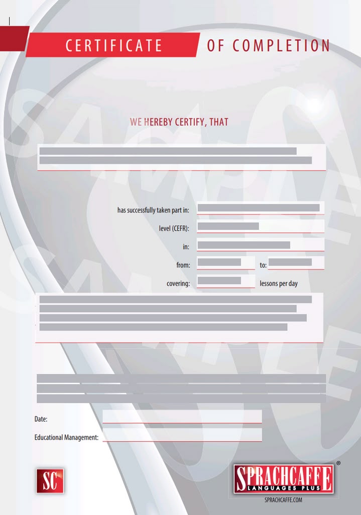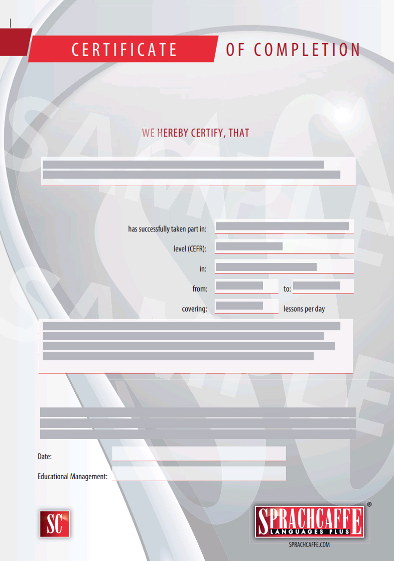 Cursuscertificaat: Dit is een officieel bewijs van succesvolle afronding van de cursus en vermeldt het aantal lessen dat de student heeft gevolgd en het behaalde taalniveau.